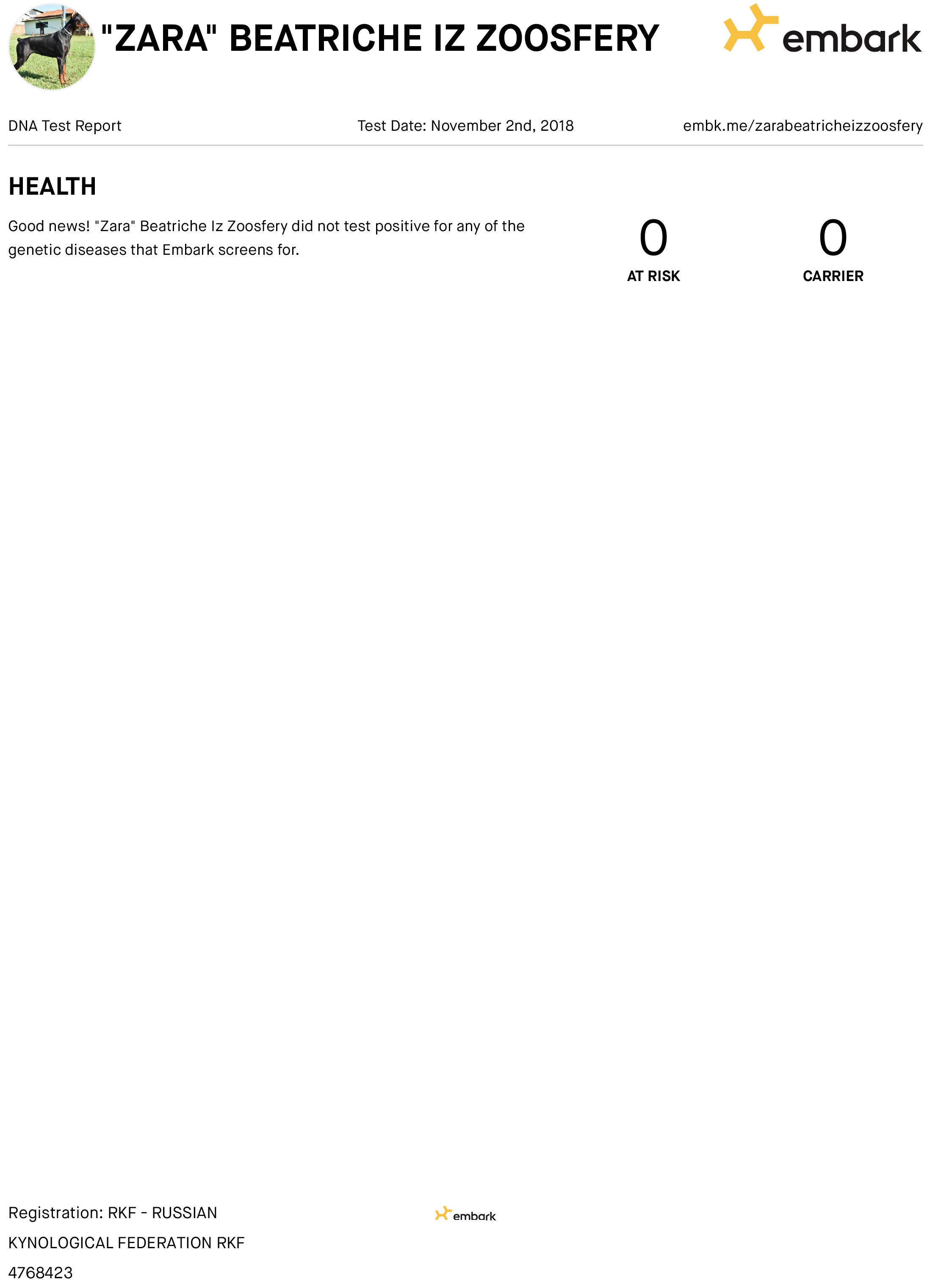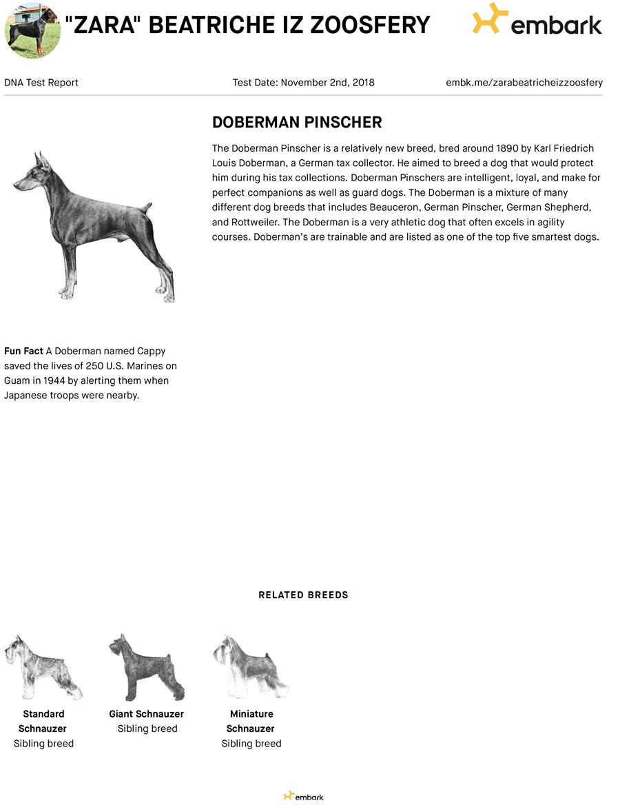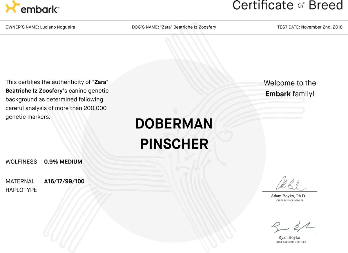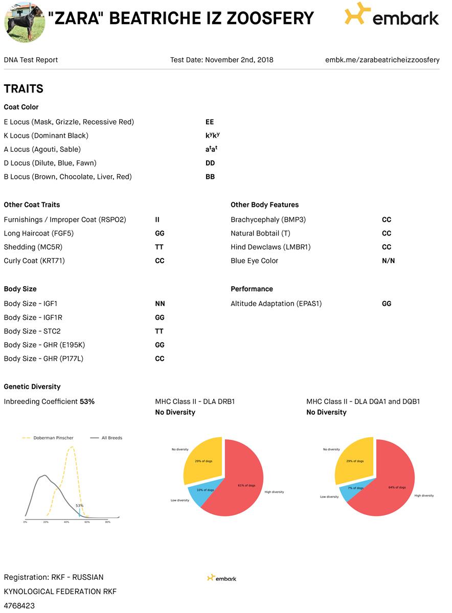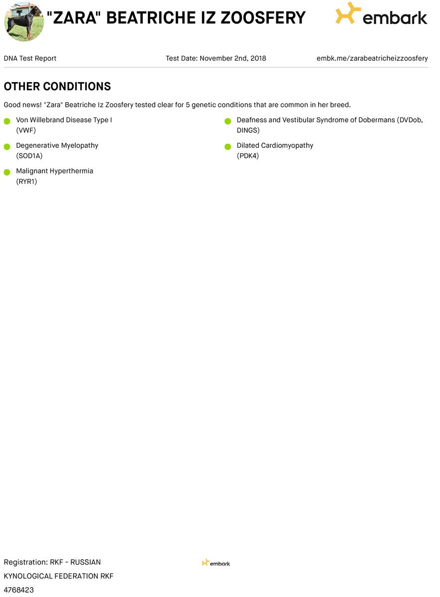 Zara também fez exames de DNA através do Dobermann Diversity Project, cujos resultados estão relacionados abaixo: