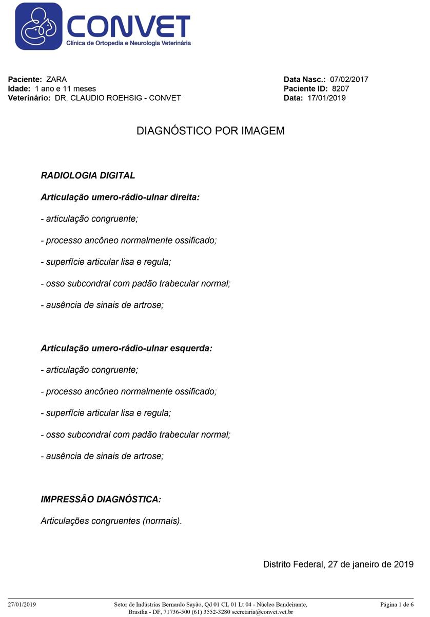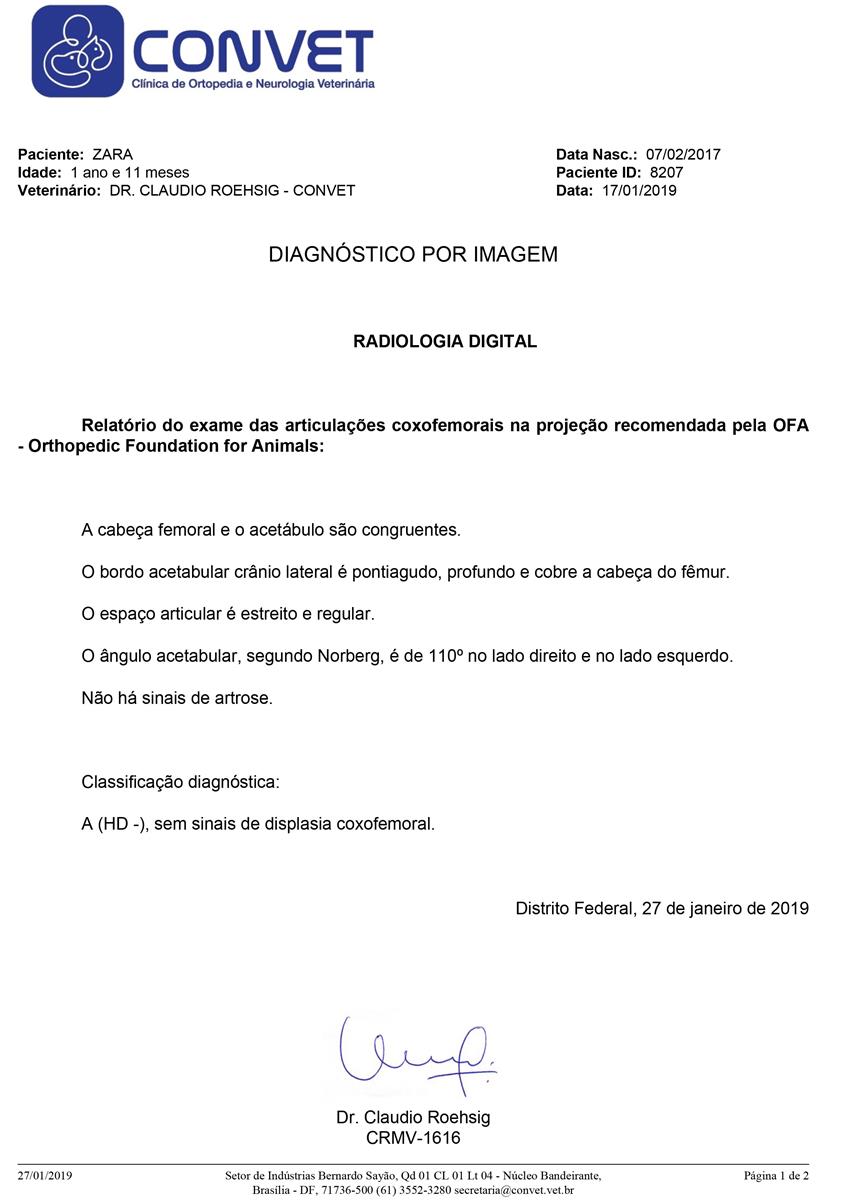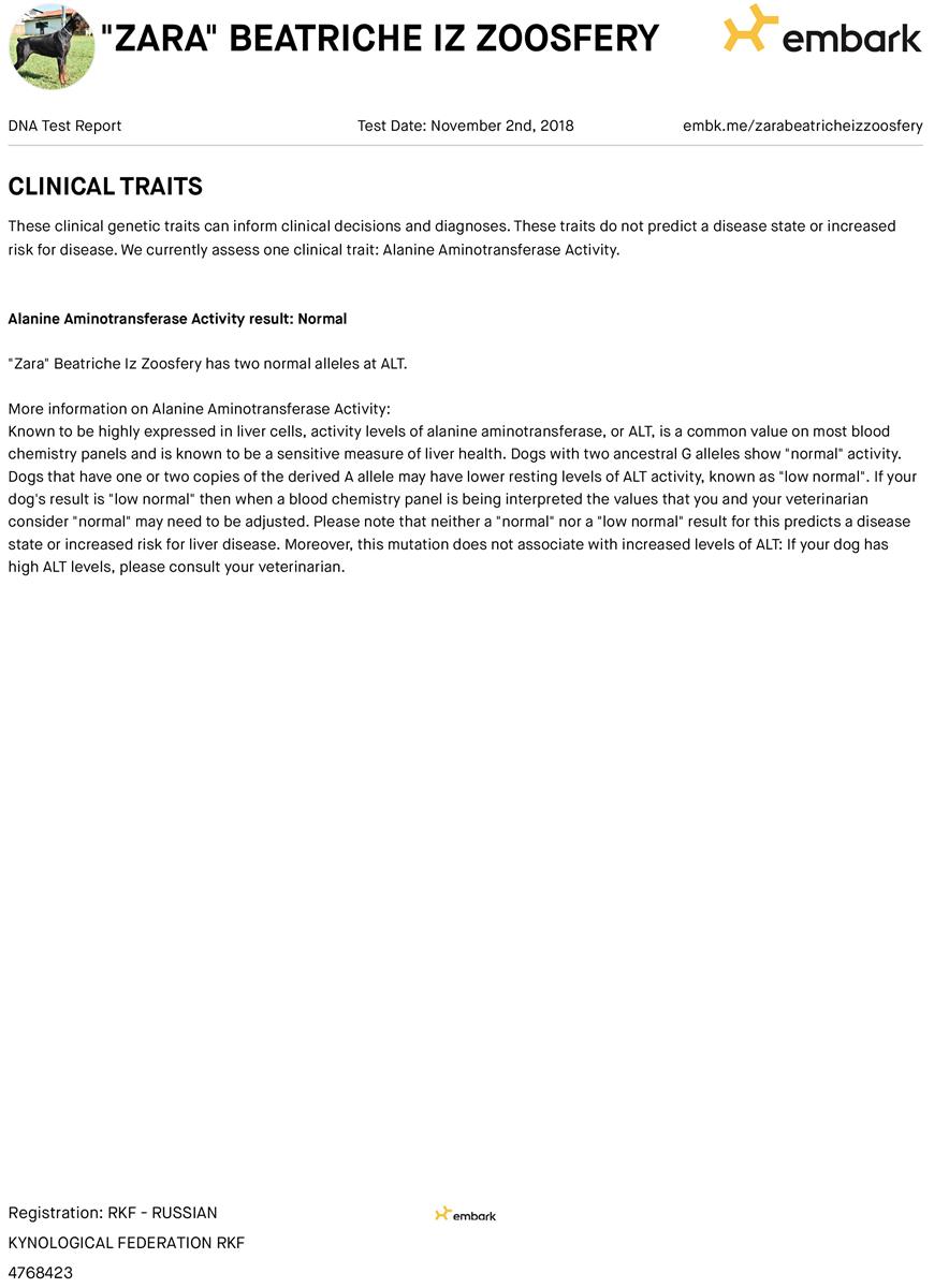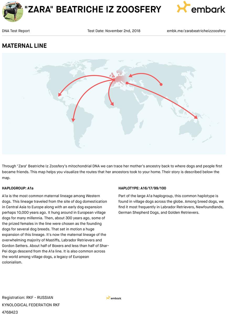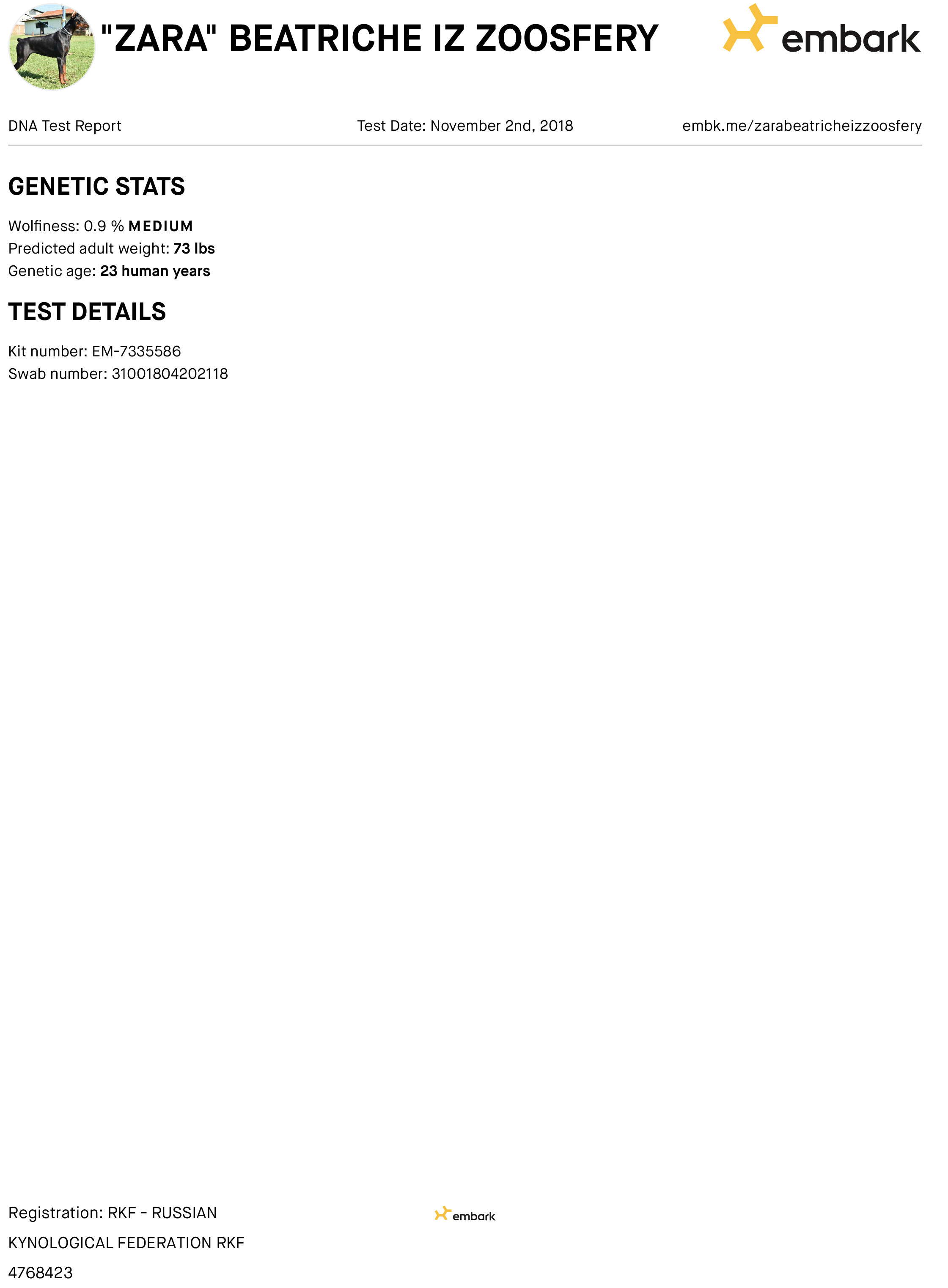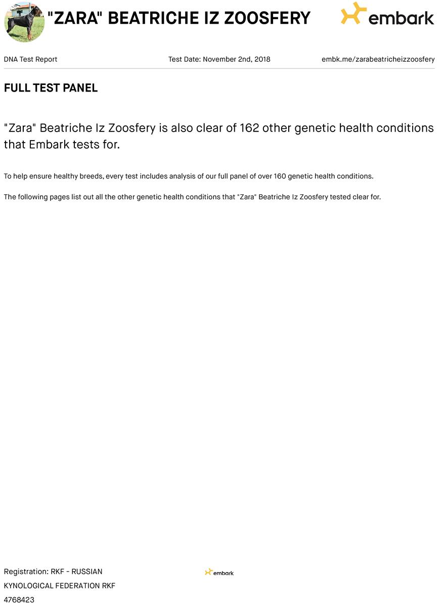 Zara também fez exames de DNA através do Dobermann Diversity Project, cujos resultados estão relacionados abaixo: